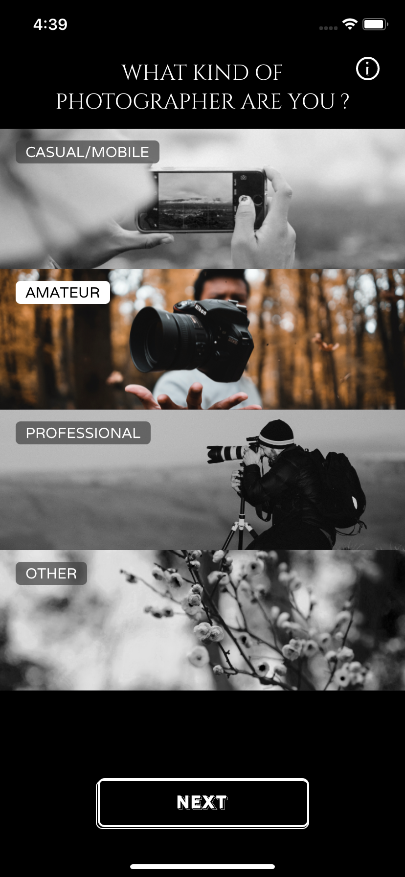 Let us know what type of photographer you are. This will help us to improve our app features.